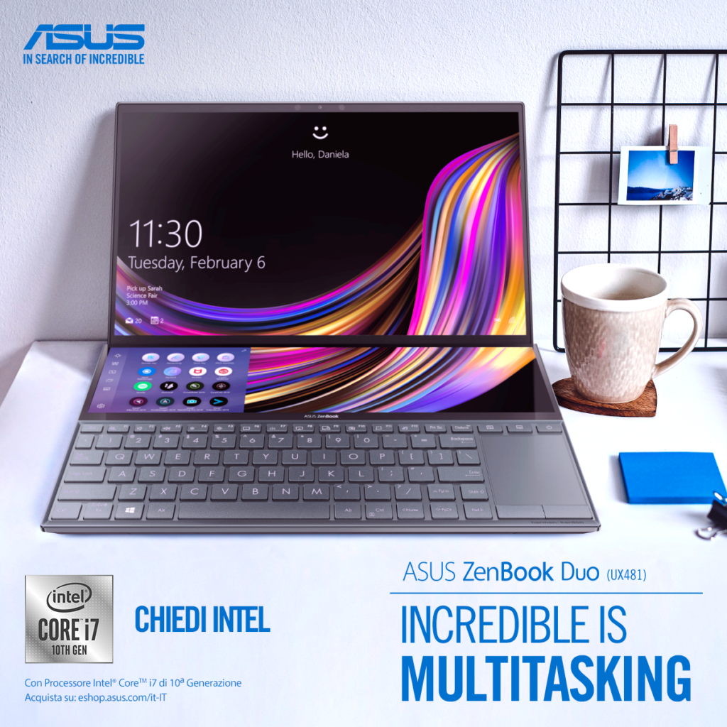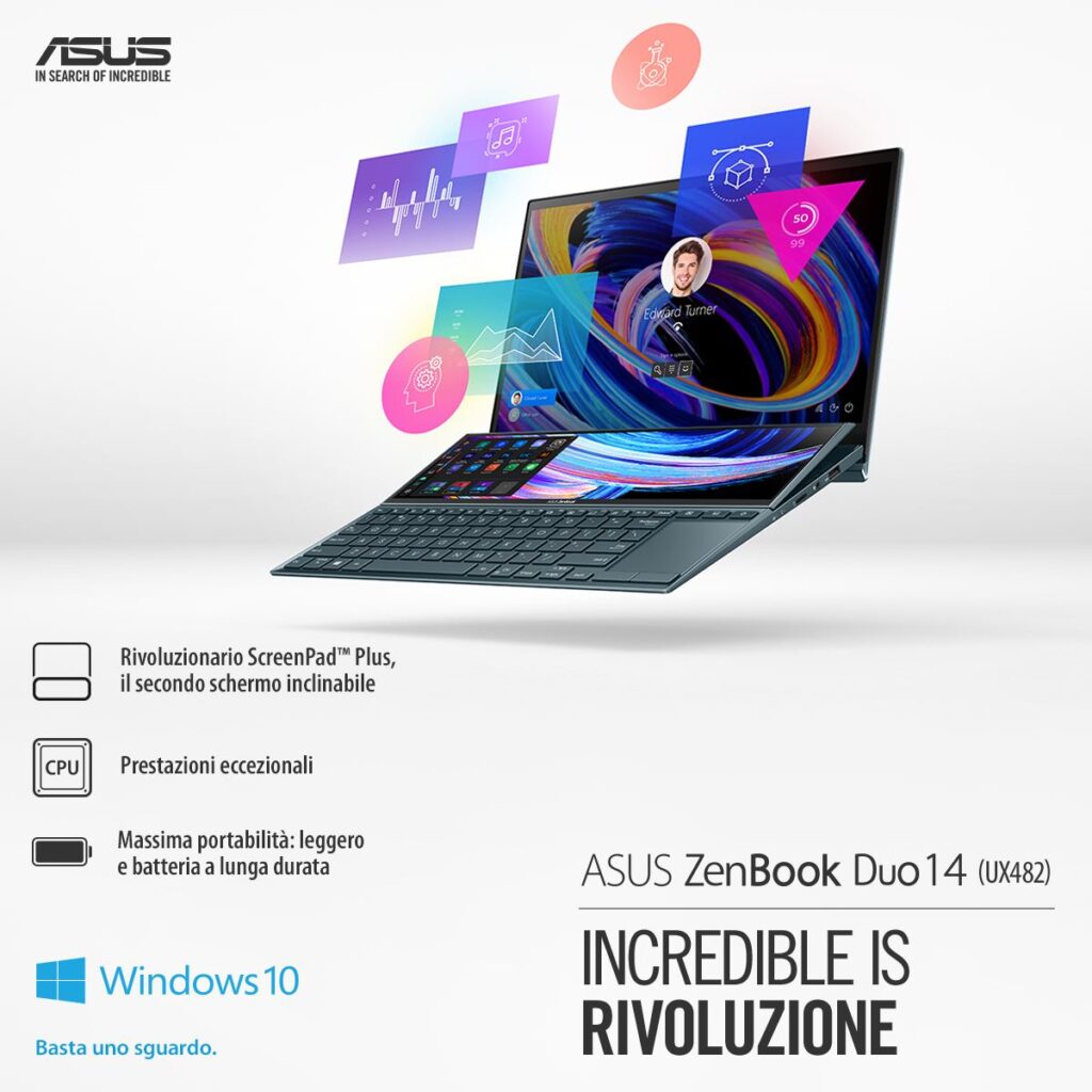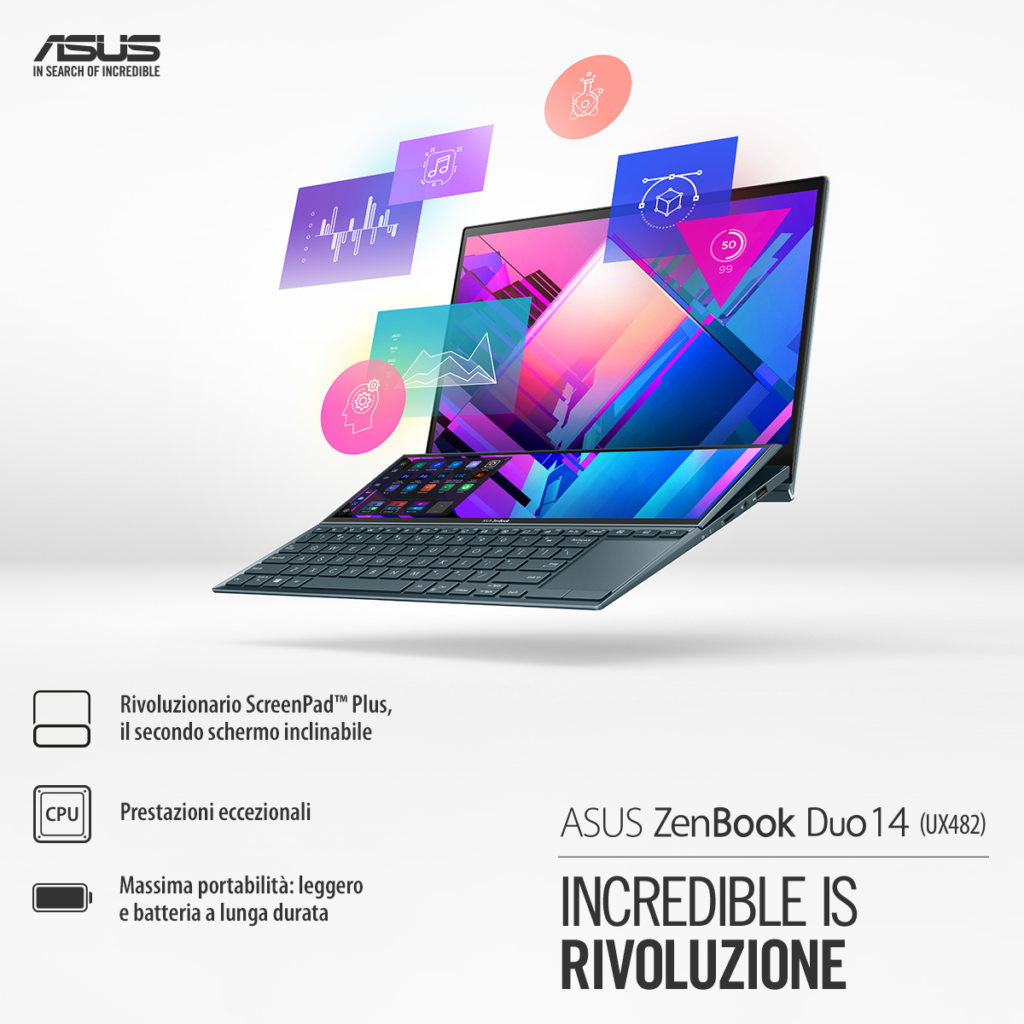 Il nuovo ZenBook Duo 14 (UX482) è arrivato anche in Italia Con il rivoluzionario ScreenPad™ Plus, il processore Intel® Core™ di 11° Generazione e uno chassis di appena 16.9mm dallo stile unico, è davvero un compagno di livello superiore per la tua produttività e creatività! Il notebook del futuro, con display secondario, ti aspetta