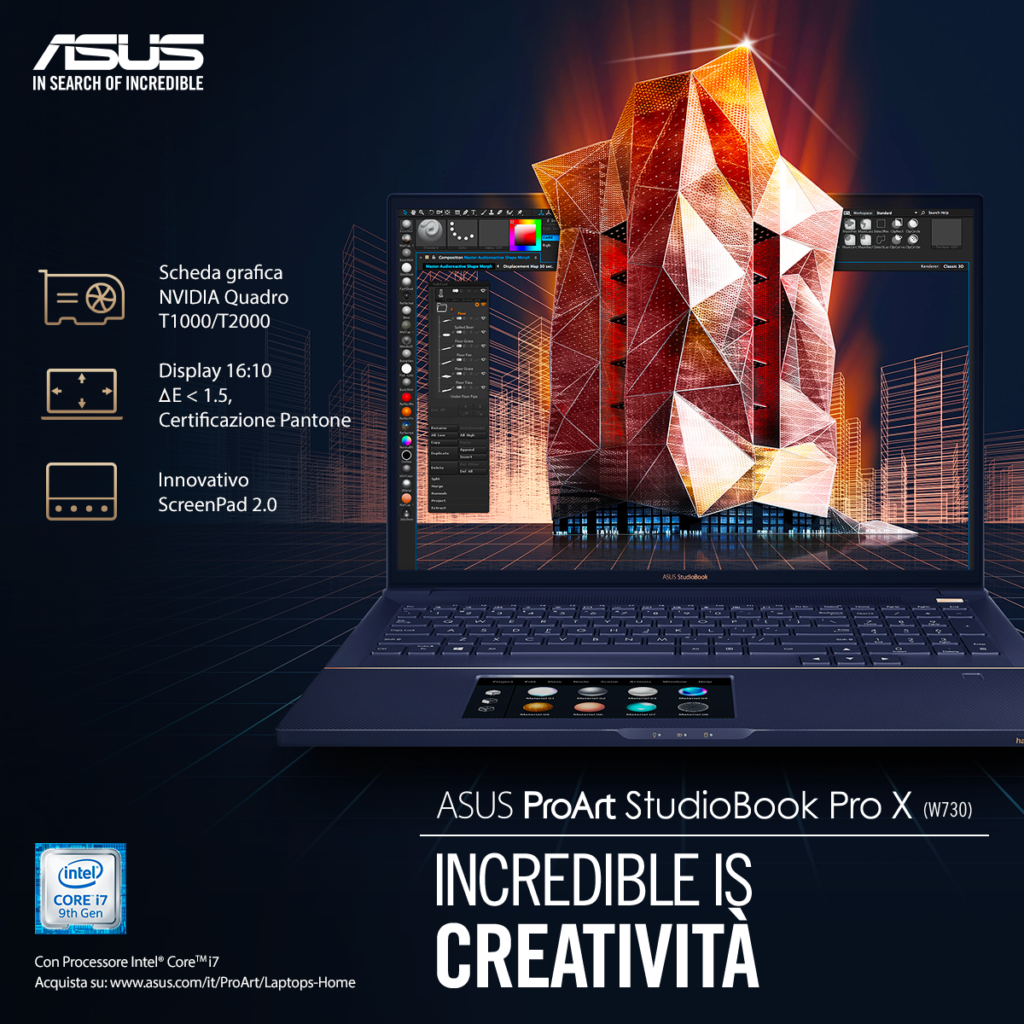 🎨 Alla scoperta della linea Notebook ProArt 🎨 ASUS presenta il nuovo StudioBook Pro X (W730)💥 Pensato per dare vita alle tue idee e alla tua creatività grazie a: 💪 Prestazioni potenti grazie alle scheda grafica NVIDIA Quadro 🌈 Display 16:10 dalla massima precisione cromatica 🆕 Innovativo ScreenPad 2.0, un secondo schermo integrato nel touchpad