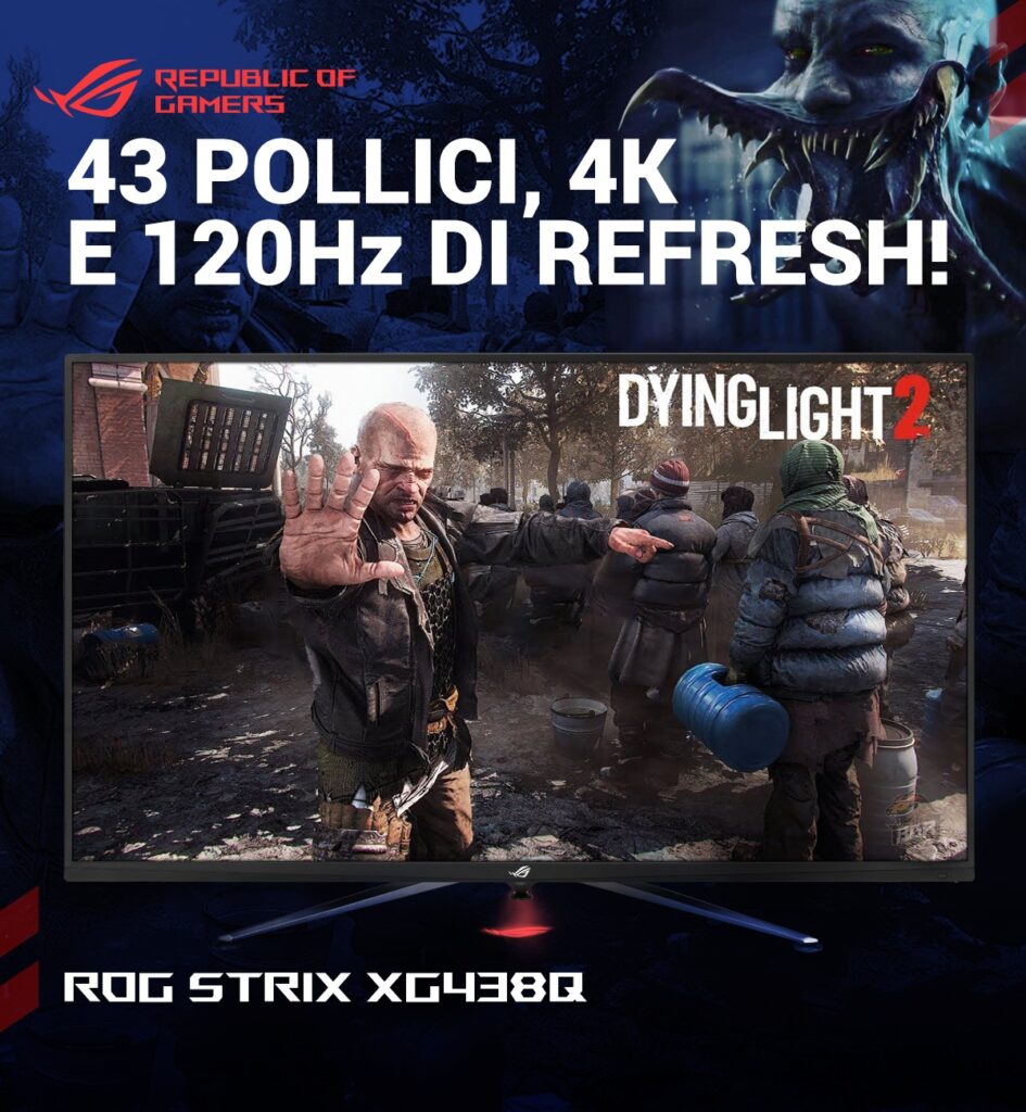 Il monitor gaming 4K dei tuoi sogni! ROG Strix XG438Q è il più grande e più veloce dispositivo video 4K HDR Freesync 2 al mondo! 43 pollici di bellezza e potenza semplicemente impareggiabili E fino al 31 agosto ti regala anche due giochi fantastici giochi: Dying Light 1 e 2